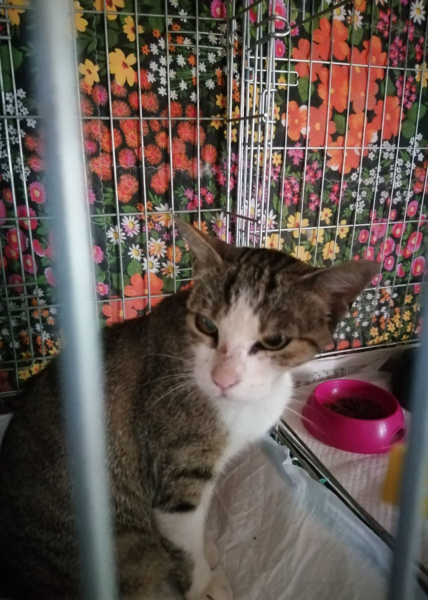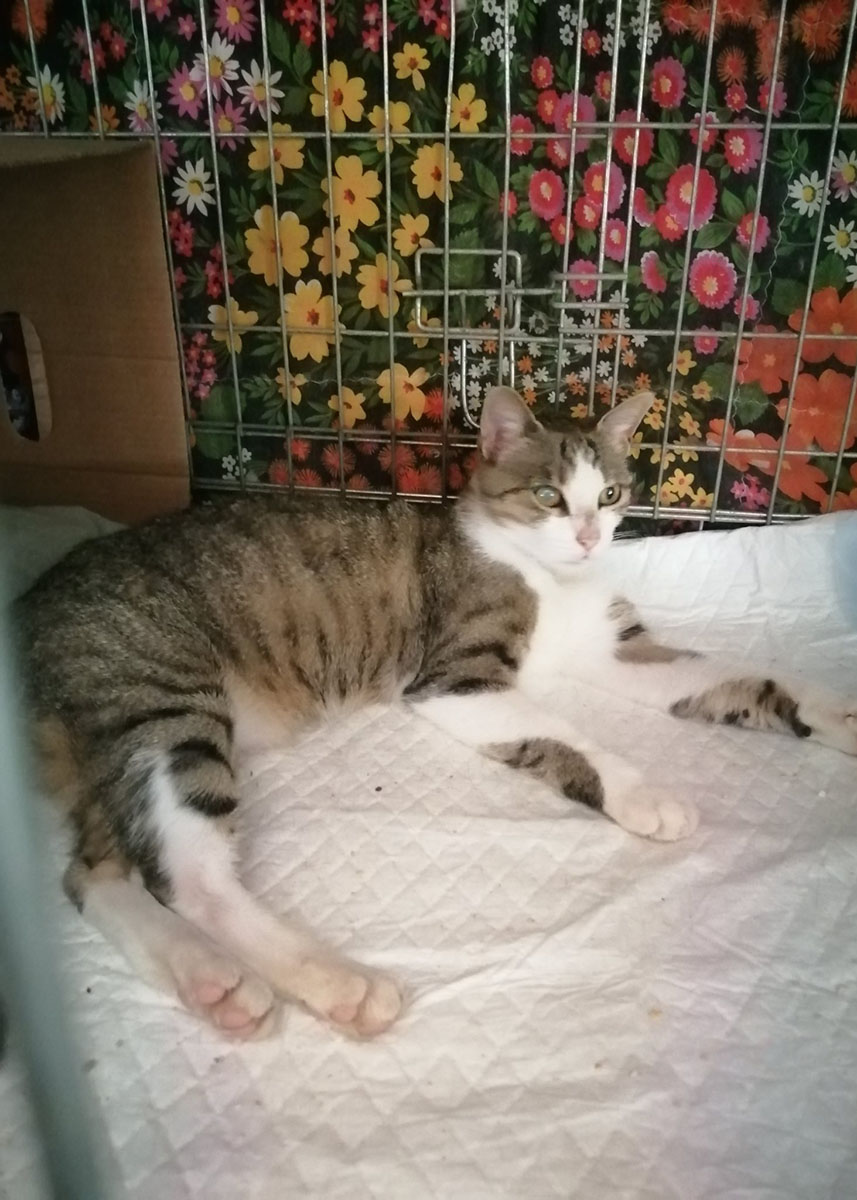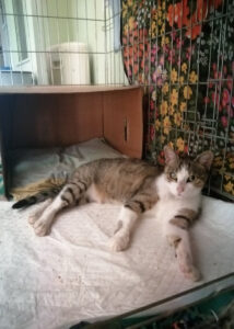 É una femmina, bianca tigrata grigia, adulta con l'occhio destro leggermente velato. Muso tipo orientale e zampe lunghe, piuttosto chiacchierona.